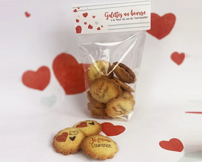 Ces galettes au beurre à la fleur de sel de Noirmoutier ne séduiront pas que les papilles de nos chers amis bretons ou vendéens. Chacun les trouvera à son goût, car goûter ces succulents petits gâteaux, c’est les adopter. Mais avant de les déguster, on vous parie que vous allez les dévorer des yeux, avec leur joli motif cœur et leur message texte personnalisé. Alors, vous les aimez un peu, beaucoup ou passionnément ces biscuits à message ?