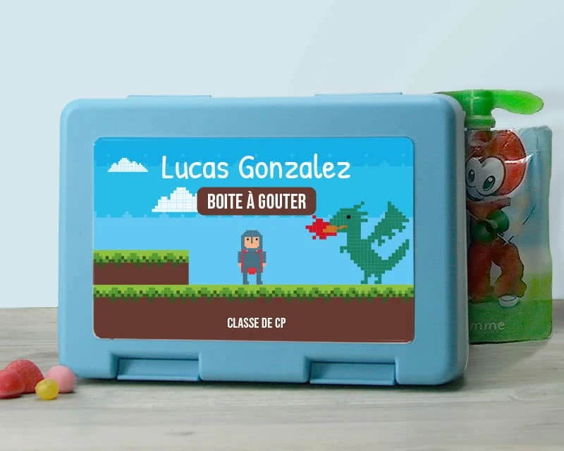 Elle est juste à la bonne taille pour contenir un goûter équilibré et reprendre des forces pendant la récréation ou une sortie scolaire, sans être lourde à porter. Son design de chevalier combattant le dragon des jeux vidéos de notre enfance lui ouvrira la porte à de nombreuses histoires d’aventures chevaleresques.