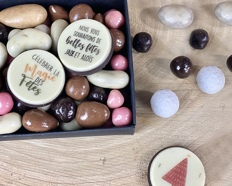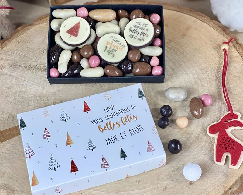 Chocolat (68%), couverture noire 66%, couverture lait 35%, beurre de cacao, sucre, poudre de LAIT ENTIER, masse de cacao, émulsifiant lécithine de SOJA, arôme vanille naturelle), NOISETTE (15 %), AMANDE (15%), agents enrobage : gomme arabique, gomme laque. MOGETTES : couverture blanche 29%, nougatine. LIQUICROC : Intérieur caramel BEURRE salé. CHOCORAISINS : raisin sec blonc. DRAGEES GUIMAUVE : gélatine de POISSON. NOISETINE : NOISETTE.CROUSTYBILLES : Semoule maïs 64%, sucre, miel 3%, sirop de glucose, huile de palme, sel, sirop de caramel. Peut contenir des céréales contenant du GLUTEN, des ARACHIDES, des FRUITS A COQUE,des PRODUITS LAITIERS, des produits à base DE SOJA, et des graines DE SESAME. Couverture blanche 29,5%, sucre, beurre de cacao, poudre DE LAIT ENTIER, émulsifiant : lécithine DE SOJA, arôme : vanille naturelle. Colorants E110 E133 E129 E124 E102 peuvent avoir des effets indésirables sur l’activité et l’attention chez les enfants.