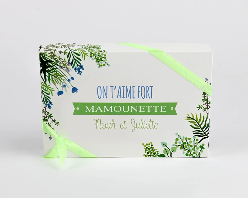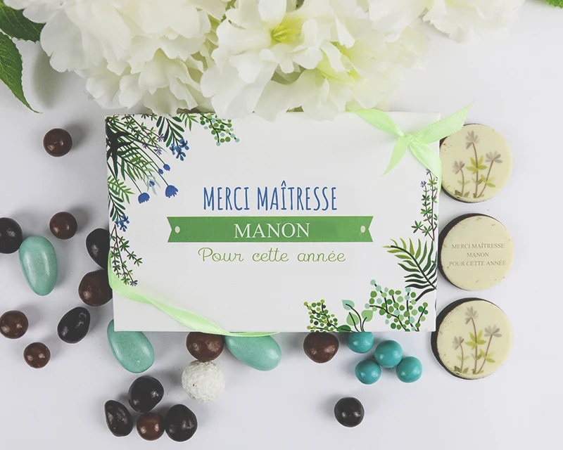 1 chocolat rond fourré caramel personnalisé + 2 chocolats fourrés caramel décorés (fleurs)