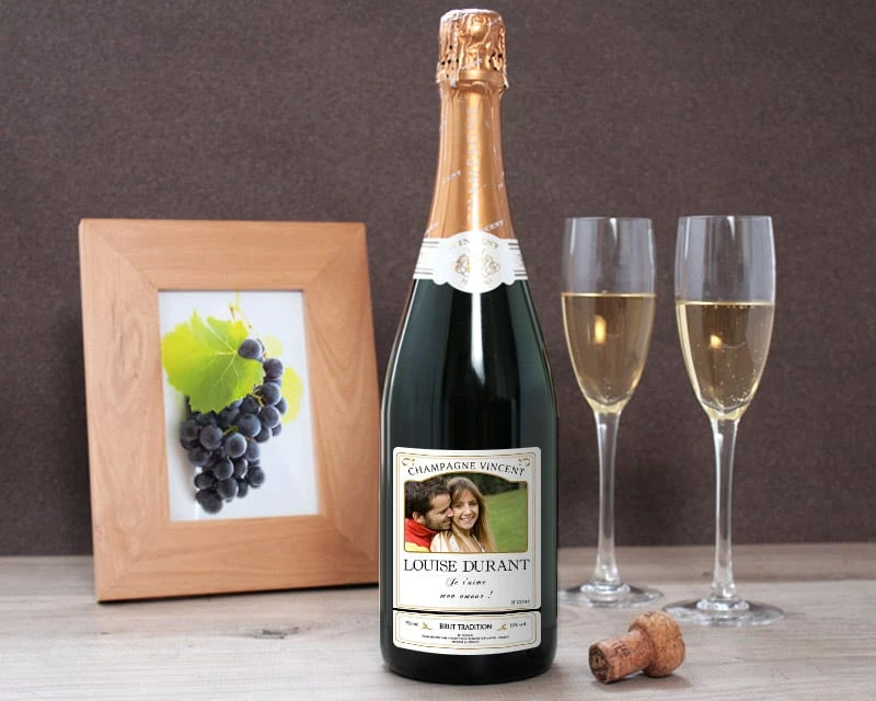Créez des souvenirs impérissables avec notre bouteille de champagne ornée d’une photo. Vous pouvez offrir ce cadeau personnalisé à l’occasion d’une fête, d’un mariage, ou simplement pour faire plaisir. Nous imprimons votre personnalisation sur une étiquette apposée sur la bouteille de champagne. Votre photo, accompagnée d’un texte personnalisé, suscitera émotion et enthousiasme.