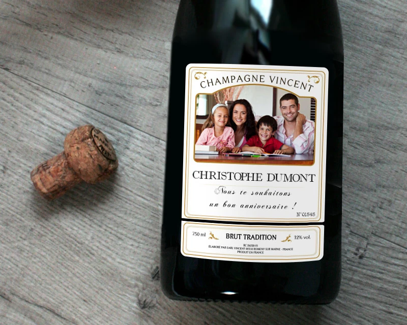 Notre bouteille de Champagne « Photo » est personnalisée par impression numérique sur étiquette papier. La personnalisation est réalisée par nos experts français de Laval.