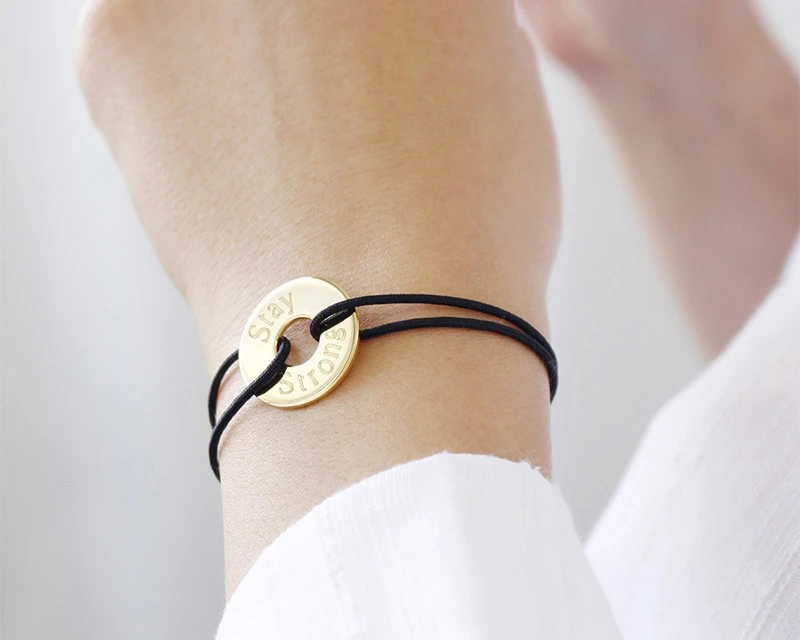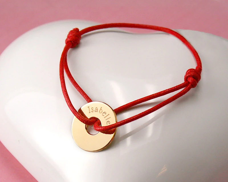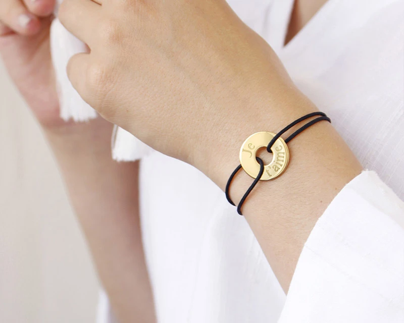 Sur un petit jeton en plaqué or ou en argent, un prénom ou une déclaration… Ce bracelet personnalisé à porter à fleur de peau symbolise le lien affectif qui vous relie à ceux que vous aimez. Un bijou rien que pour vous ou à offrir à l’occasion de la fête des mères, un anniversaire, la Saint-Valentin ou pour Noël. Choisissez la couleur du bracelet : noir, rouge, rose clair ou beige, il y en a pour tous les goûts !