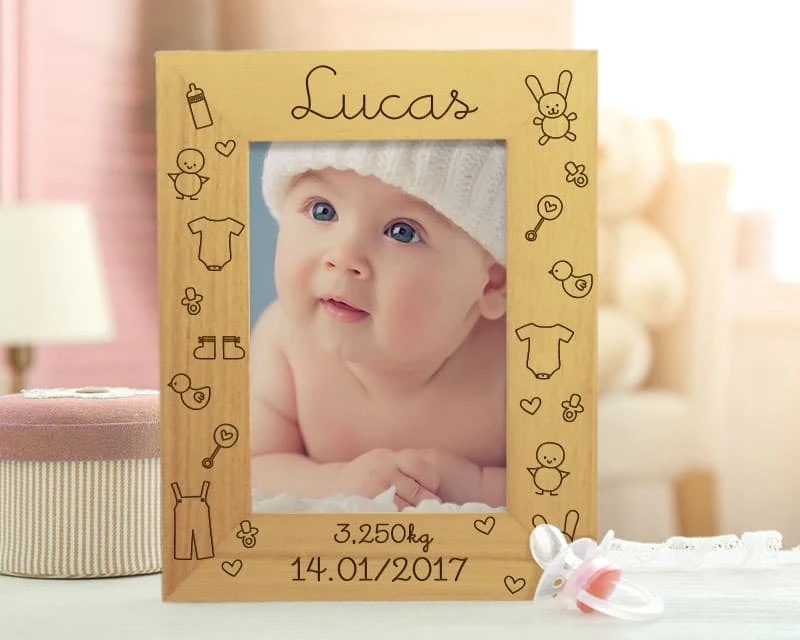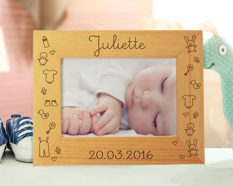 Faites graver sur le cadre son prénom, son poids et sa date de naissance à la manière d’un faire-part.