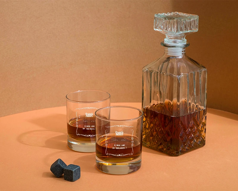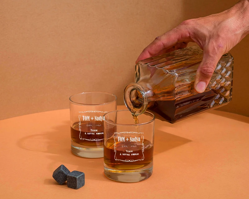 Ambiance élégante et vintage pour ce set de dégustation de whisky composé d’une carafe et de deux verres personnalisés.