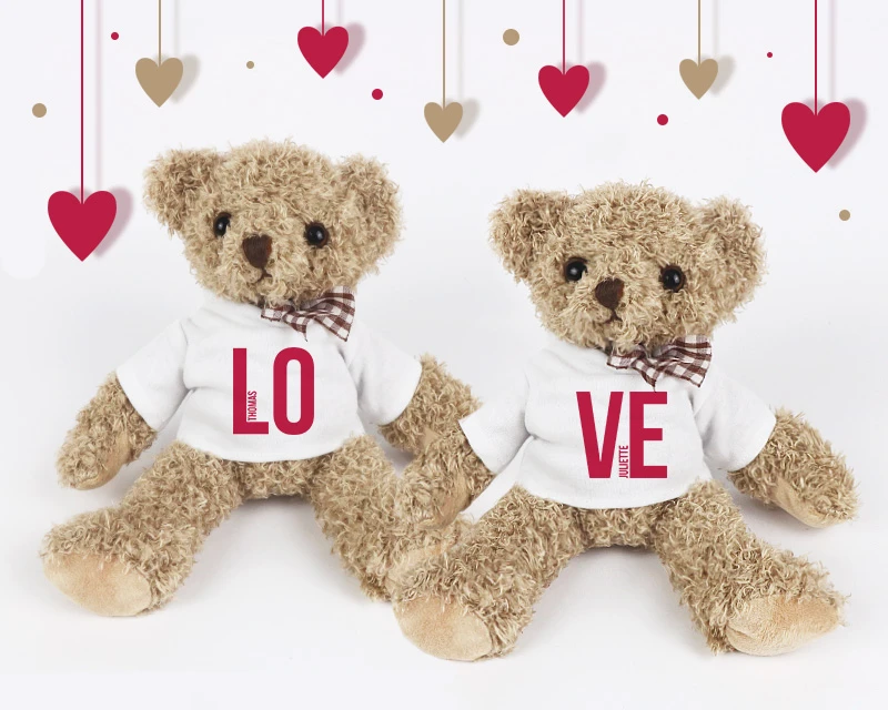 VoilĂ une idĂ©e cadeau trop chou pour la Saint-Valentin ! Deux peluches toutes mignonnes personnalisĂ©es, un pour Elle et l’autre pour Lui ! Partagez l’amour avec votre bien aimĂ©(e) et offrez-lui un ourson avec son tee-shirt personnalisĂ© de votre nom et gardez celui avec son prĂ©nom, pour penser Ă l’autre Ă chaque instant. IdĂ©e cadeau idĂ©ale pour couple !