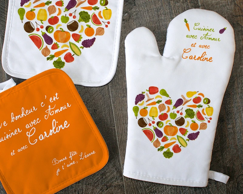 Vous cherchez un cadeau original et unique ? Ce lot de gant et maniques est indispensable dans la cuisine d’un grand chef ! Cuisinez avec Amour et apportez une petite touche de tendance à votre cuisine. Personnalisez-le avec un prénom. Un cadeau à commander juste pour soi ou pour toute la famille. Il sera parfait pour toutes les occasions.