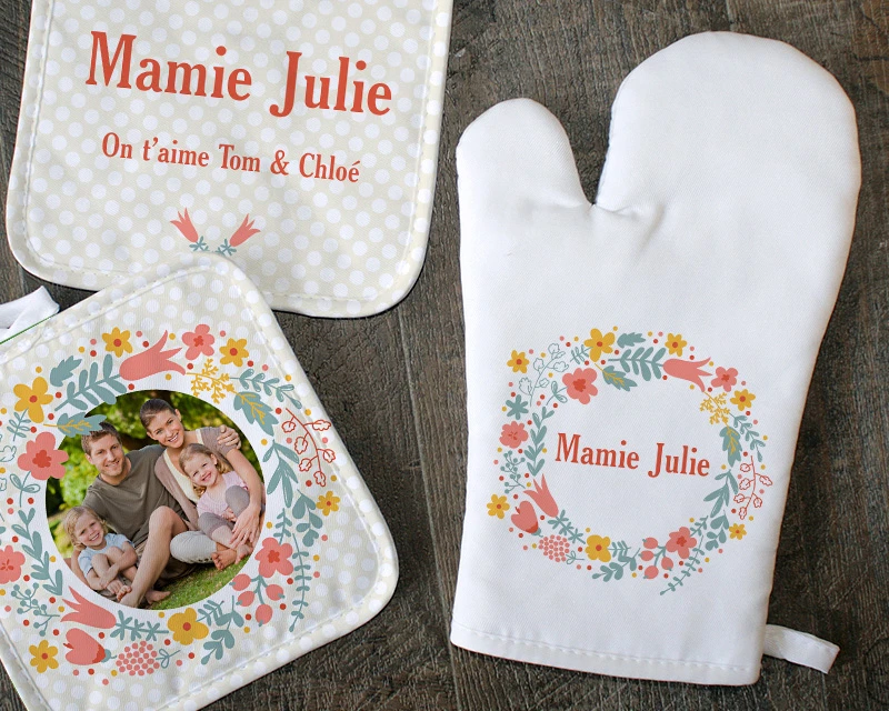 Vous recherchez des idĂ©es cadeau pour la fĂȘte des Grands-MĂšres ? Notre set Gants et Maniques – Fleurs personnalisĂ©, indispensable pour cuisiner au quotidien, ravira votre mamie.
