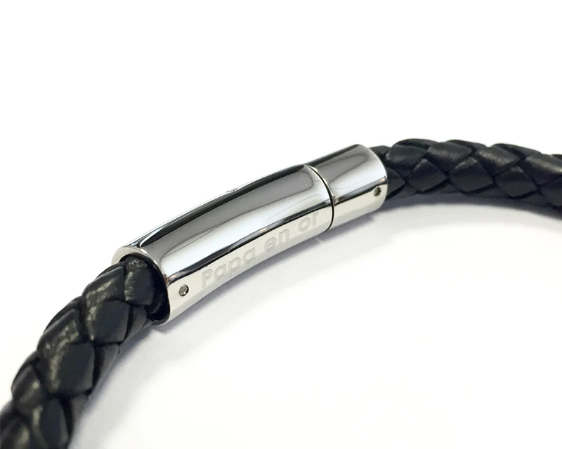 L’association du cuir et de l’acier de ce bracelet gravĂ© homme rehausse tous les looks, du plus casual au plus chic, ce qui en fait un indispensable de tous les dressings masculins. Et Monsieur ne manquera pas une occasion de le porter, grĂące Ă son fermoir magnĂ©tique ultra-pratique.