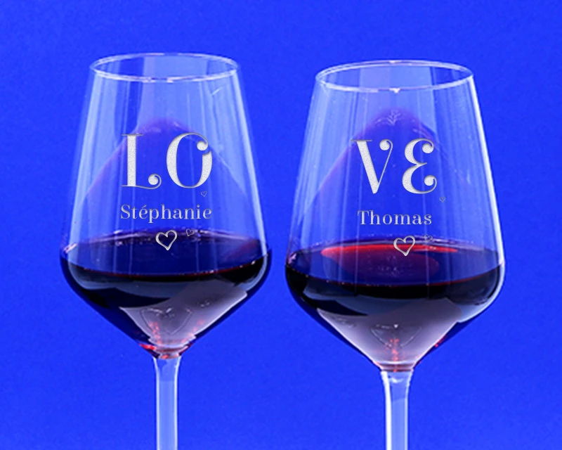 Trinquez en couple à l’amour qui vous unit avec ce lot de 2 verres à vin Love à personnaliser avec vos prénoms respectifs.