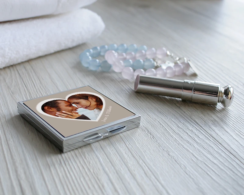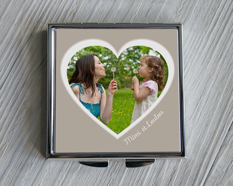Miroir, Miroir, qui est la plus belle ? Pratique et élégant, ce miroir se glisse facilement dans un sac à main, une poche… à tout moment, il vous dira qui est la plus belle ! Personnalisez-le avec une belle photo dans un coeur. Un cadeau unique et original à offrir pour toutes les occasions !