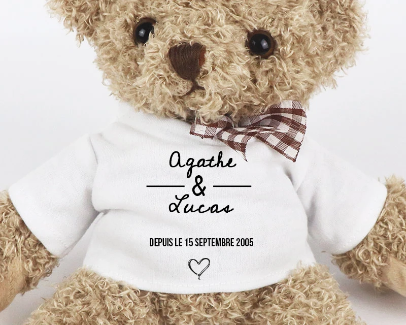 Vous pouvez personnaliser nos ours en peluche au gré de vos envies. Outre le prénom de votre partenaire et le vôtre, vous êtes libre d’ajouter le texte de votre choix (35 caractères maximum). Voici quelques suggestions de messages pour célébrer votre amour :