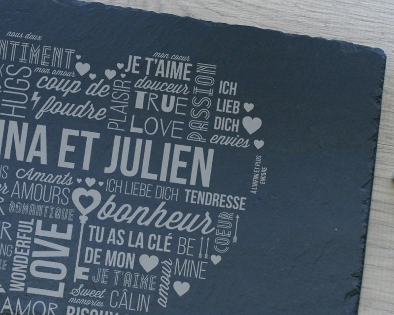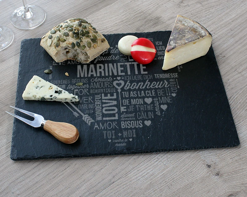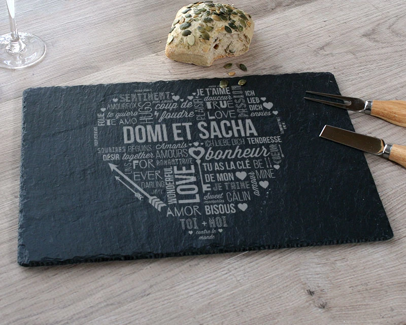 Pour vos soirées apéritifs en amoureux, sublimez votre table avec cette magnifique ardoise gravée ‘Mots d’Amour’. Personnalisez-la avec votre nom ainsi que celui de votre partenaire. Idée cadeau originale pour homme et pour femme. Offrez ce plateau ardoise gravé à l’occasion d’un mariage, de la Saint-Valentin, une pendaison de crémaillère pour un couple, effet garanti !