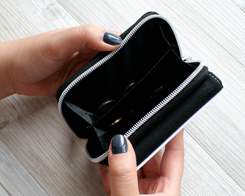 L’intérieur est équipé de 4 compartiments à cartes, 1 compartiment pour billets et un porte-monnaie avec fermeture éclair.