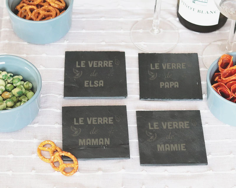 Ensemble de 4 sous-verres personnalisés en ardoise. Chaque sous-verre est équipé de patins anti-rayures pour protéger la table.