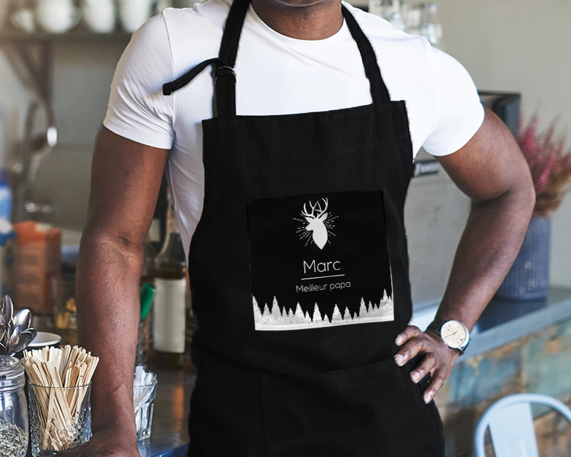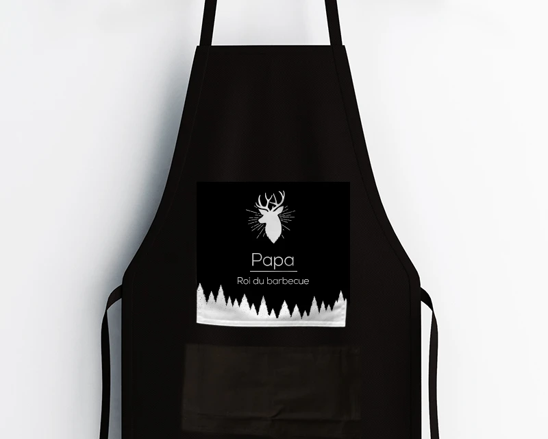 Que serait un cuisinier sans son tablier ? Aujourd’hui Cadeaux.com décline sa collection Cerf sur son tablier noir. De quoi vous faire remarquer auprès de vos amis lors d’un barbecue par exemple. Rendez-le unique en le personnalisant du texte de votre choix. Un anniversaire, la Fête des Pères… les occasions ne manquent pas pour faire plaisir !